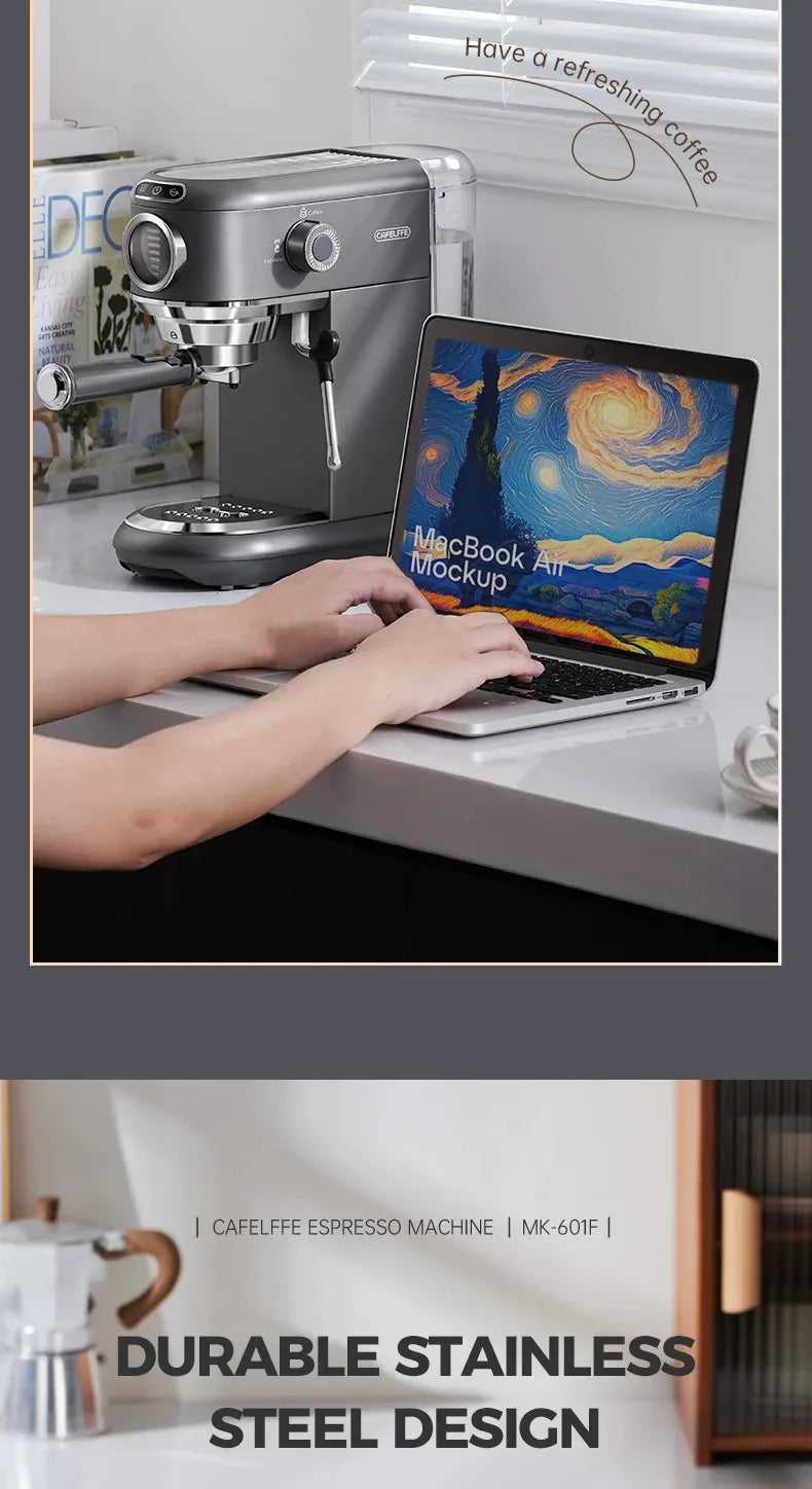 CAFELFFE Stainless Steel Espresso Machine Professional 19-bar extraction, milk steamer and 4-in-1 compatibility – café quality at home.