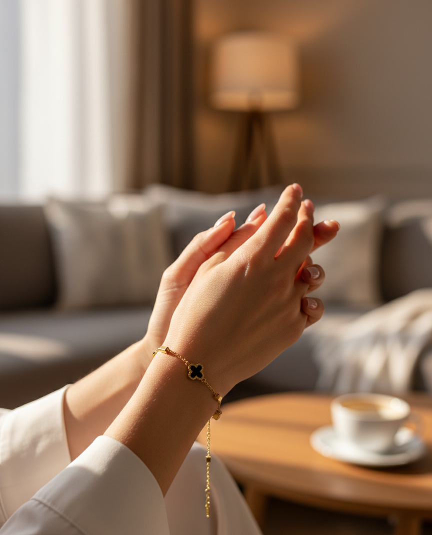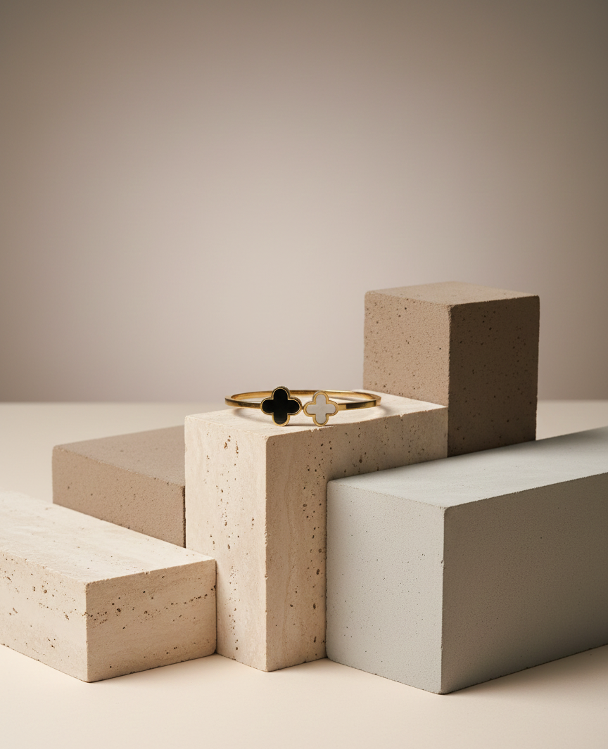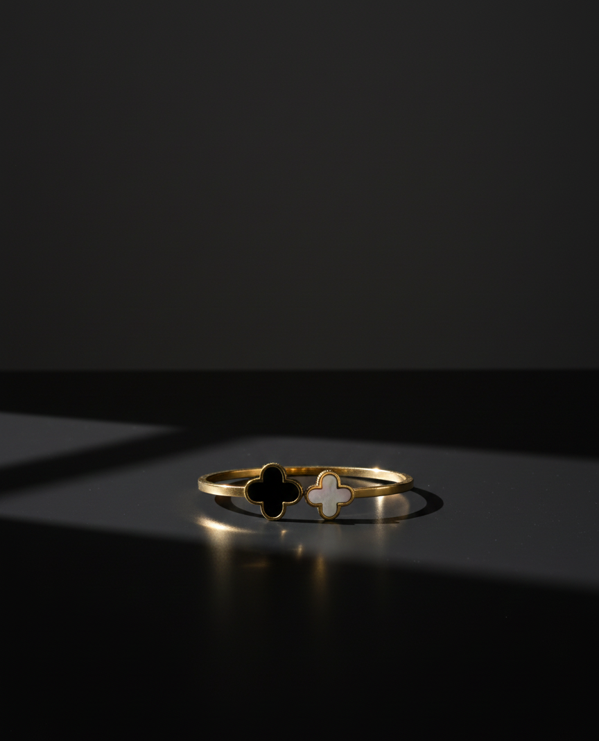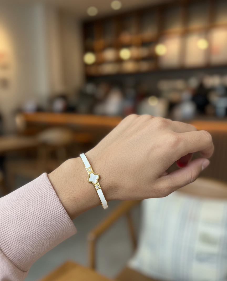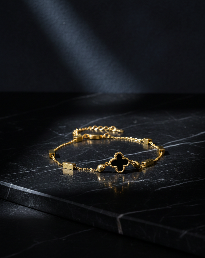 Dieses elegante Armband besticht durch sein vierblättriges Design. Eine gelungene Mischung aus Punk-Charme und femininer Eleganz – perfekt für jedes Outfit.